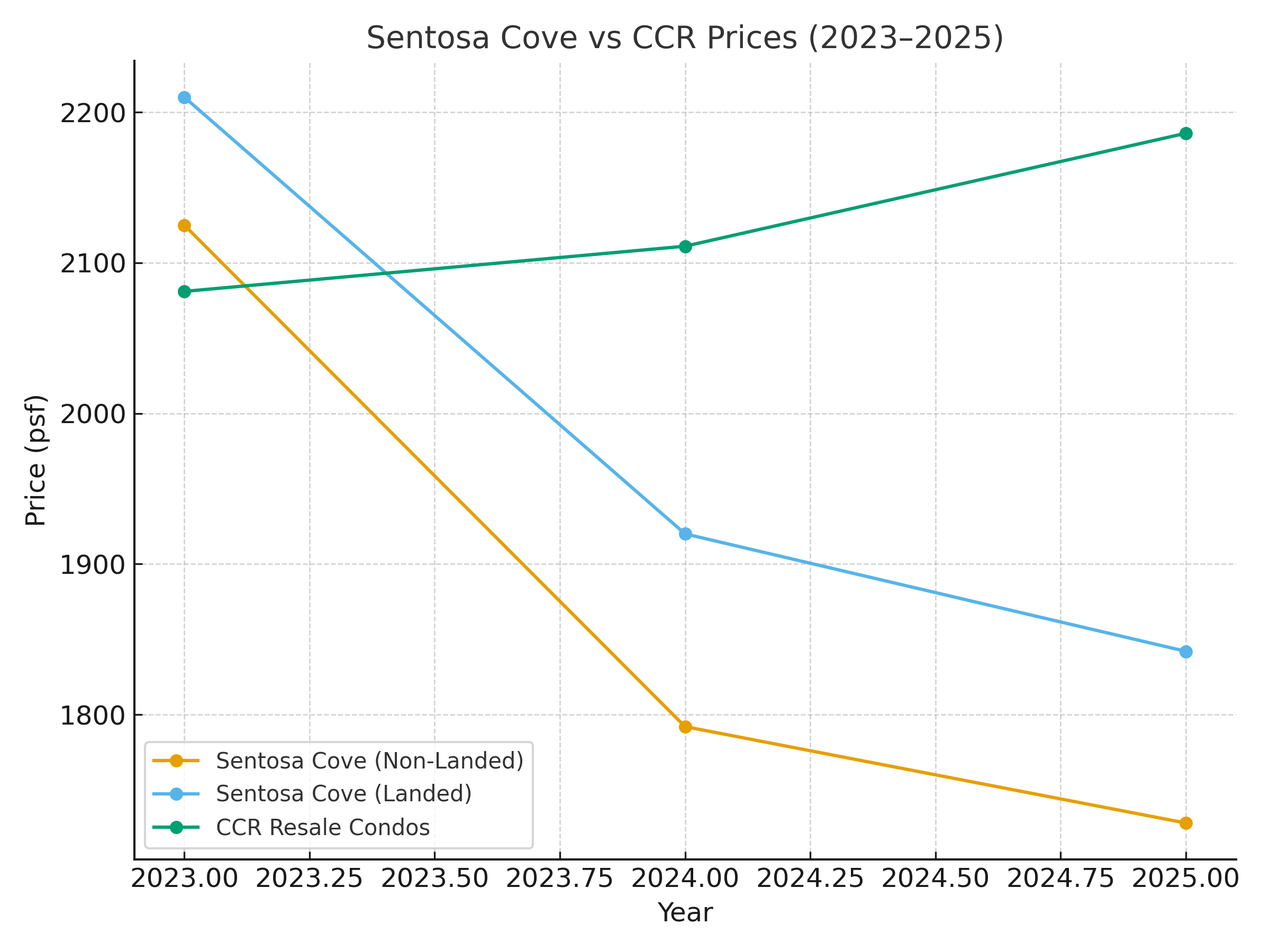 Prices for non-landed homes fell about 18.7%, from $2,125 psf in 2023 to $1,728 psf this year. Landed prices dropped roughly 13%, from $2,210 psf to $1,842 psf. By contrast, resale condominiums in the Core Central Region (CCR) climbed to $2,186 psf, underscoring how Sentosa has decoupled from the broader luxury market.